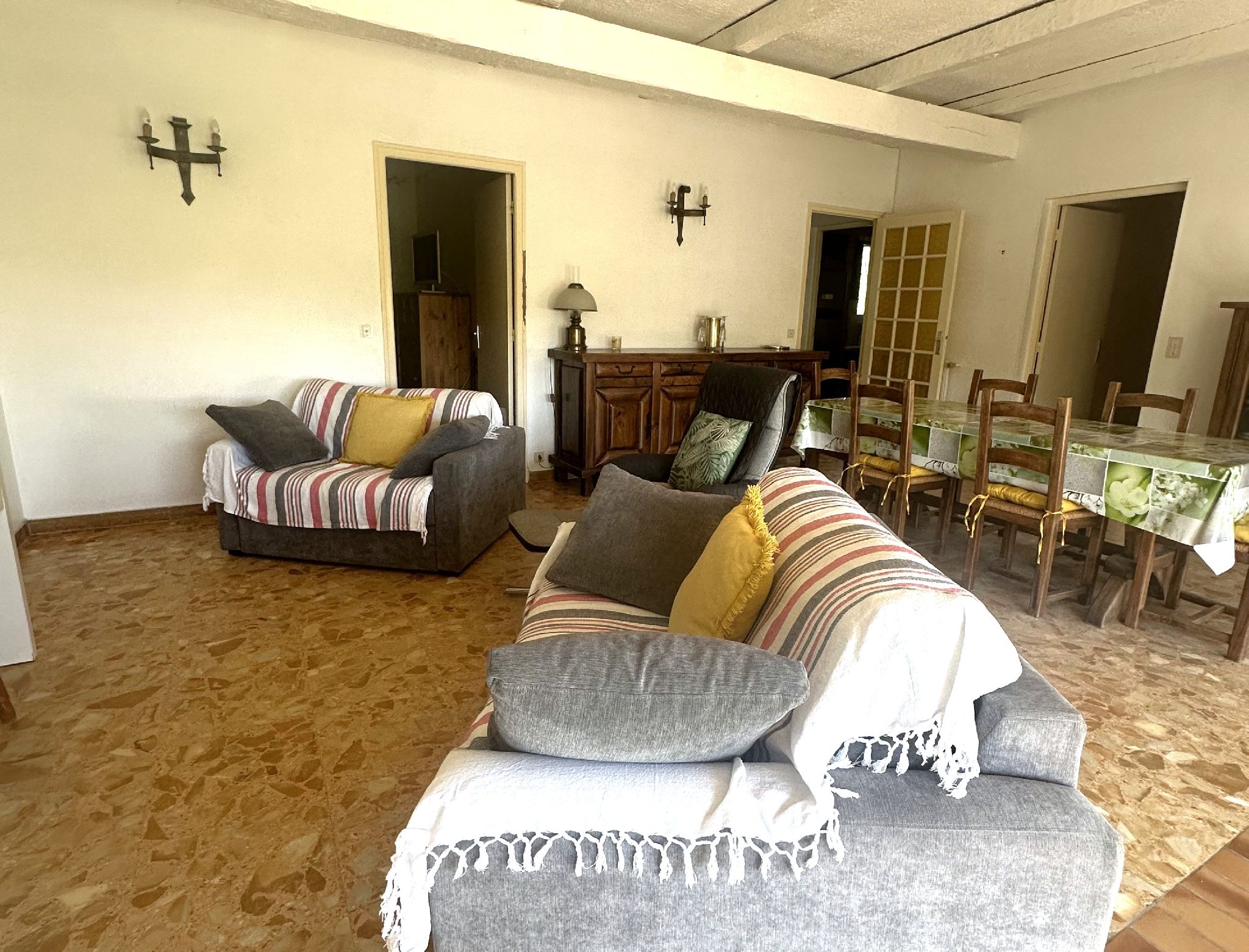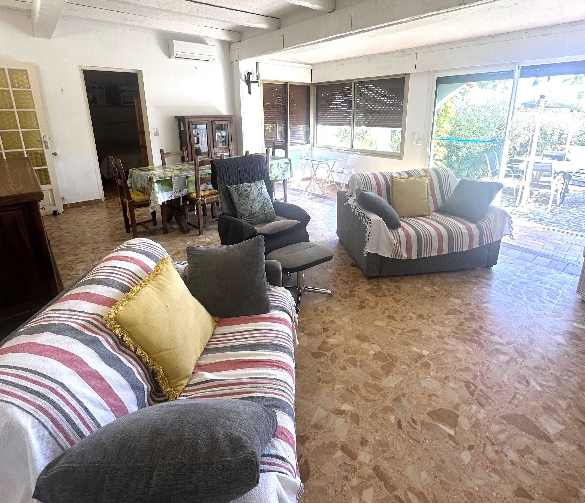 Dès l'entrée, vous découvrirez une pièce de vie climatisée et lumineuse, agréablement aménagée et pensée pour votre confort : un coin détente avec canapé et téléviseur, et un espace repas convivial.