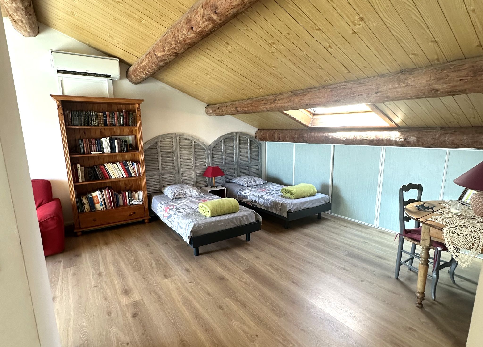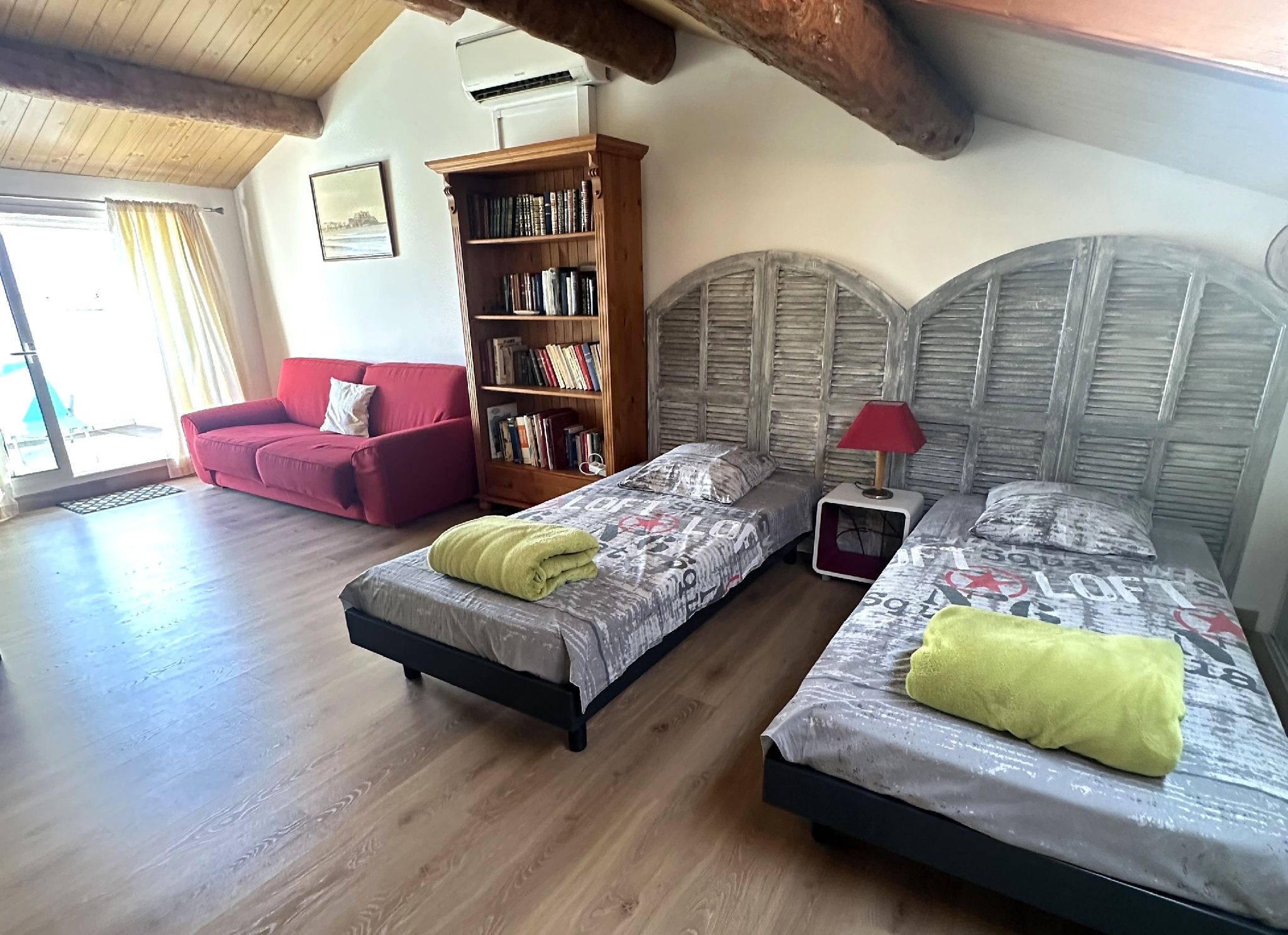 A l'étage, un palier dessert, d'un côté, un espace ouvert climatisé, aménagé avec deux lits simples et canapé convertible ainsi qu'une salle d'eau avec WC. Le tout donne accès à une petite terrasse avec vue panoramique sur la baie de Calvi.