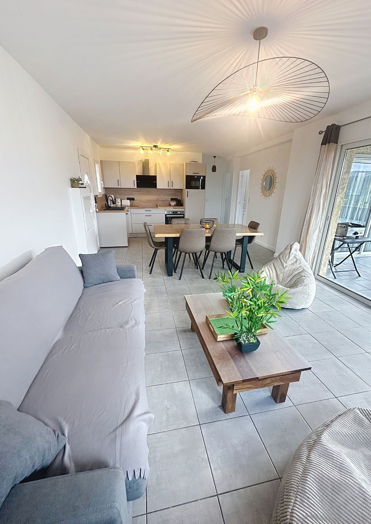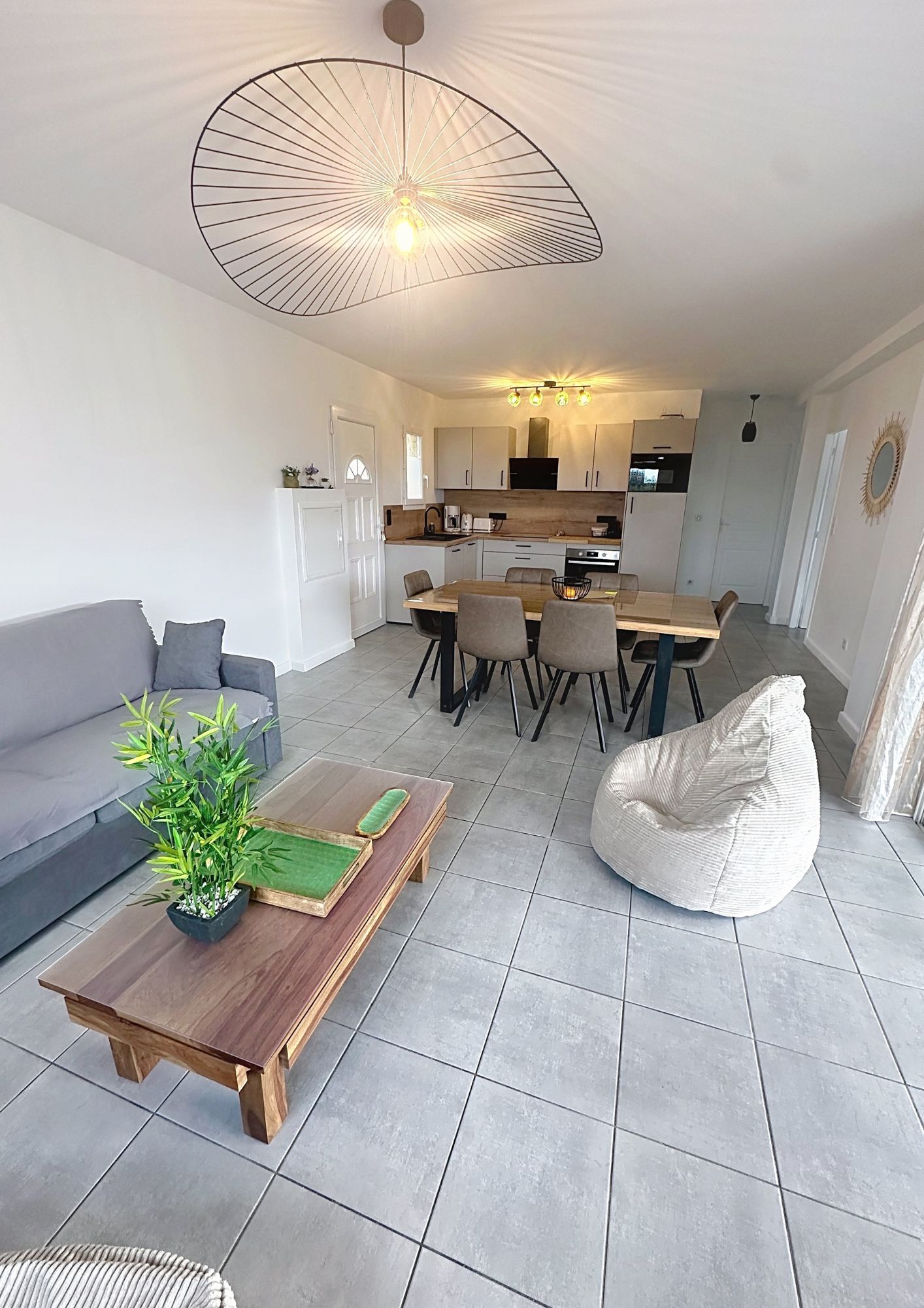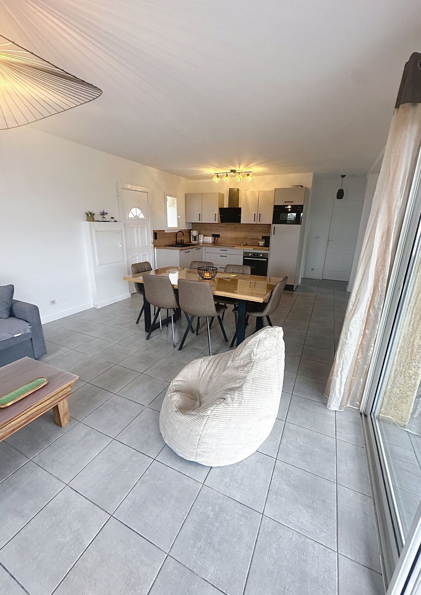 La cuisine moderne, hautement équipée, s'intègre parfaitement à l'espace repas et invite à partager des moments conviviaux. Le salon, confortable et chaleureux, est aménagé avec un canapé de qualité et un téléviseur, offrant un véritable espace de relaxation.