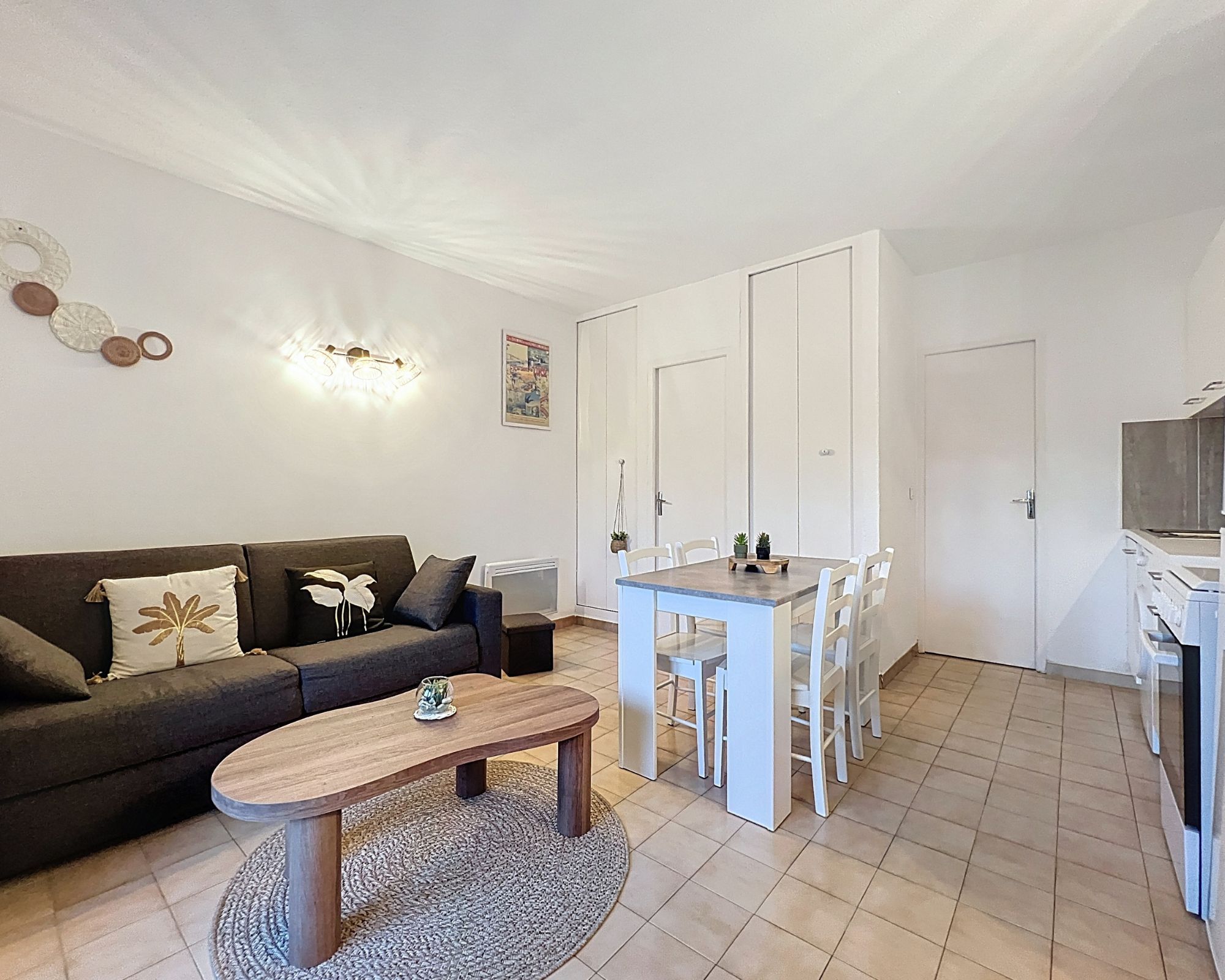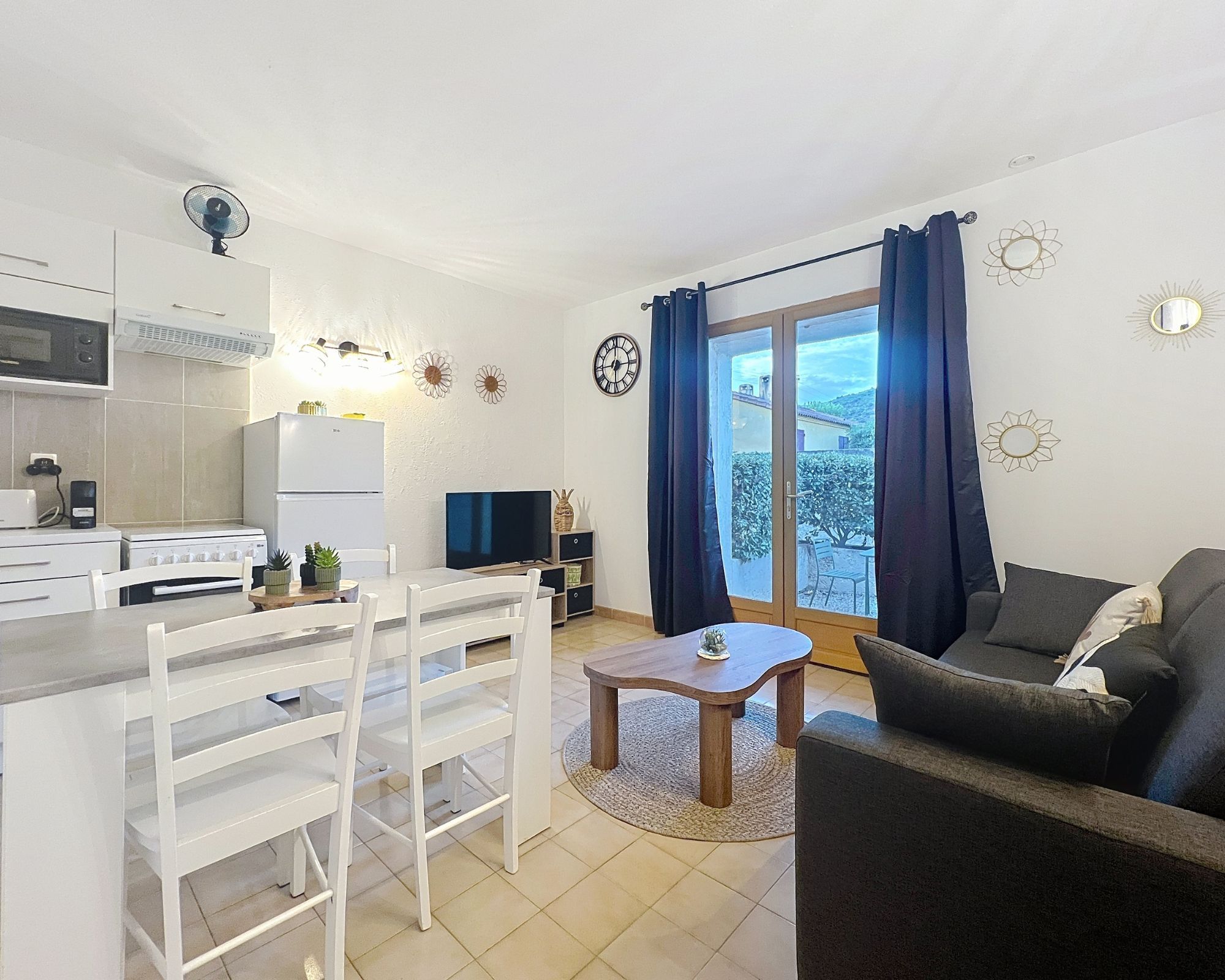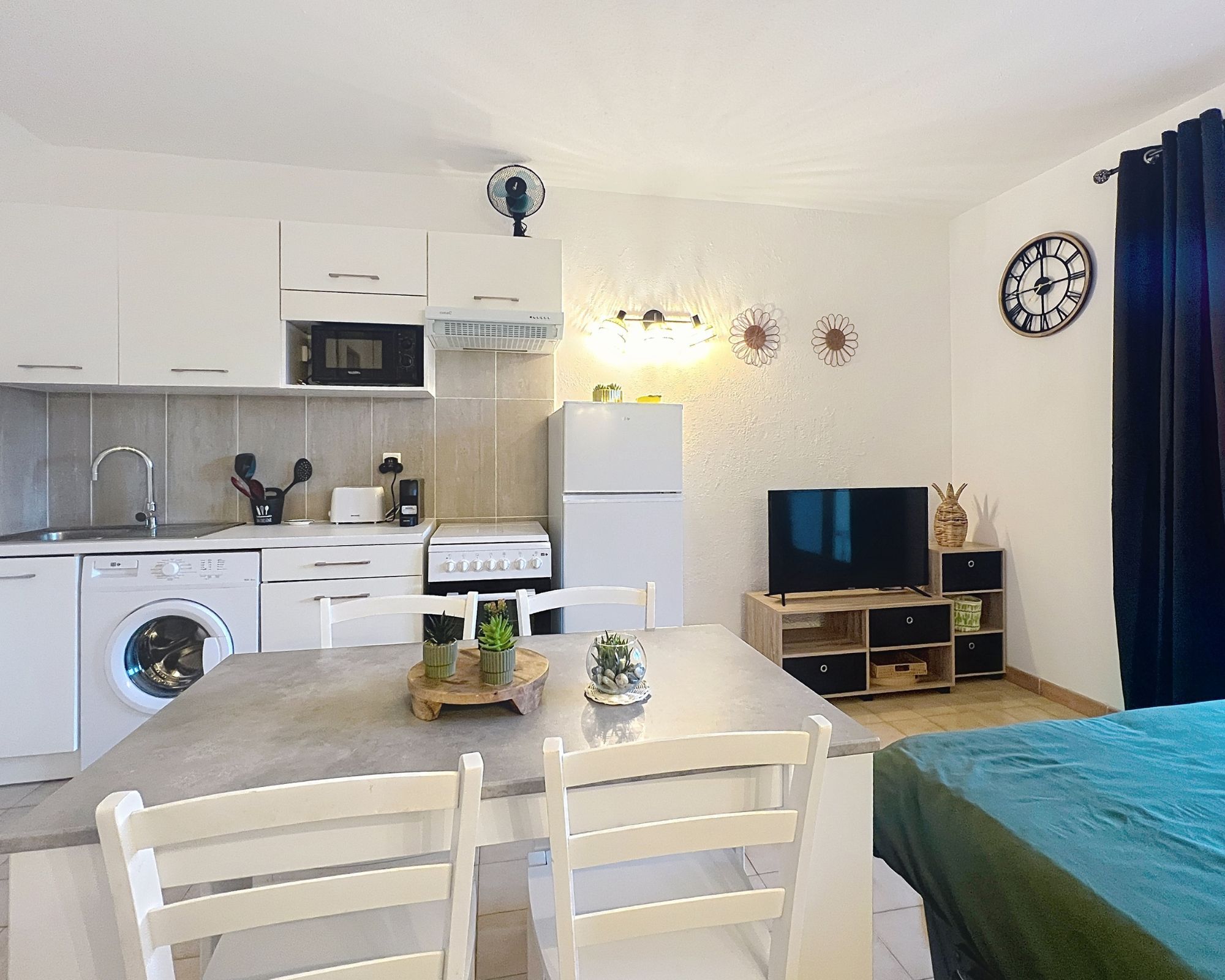 L'espace principal se compose d'un coin cuisine entièrement équipé et fonctionnel ouvert sur un Salon/séjour lumineux et accueillant aménagé avec un espace repas ainsi qu'un canapé convertible et téléviseur.