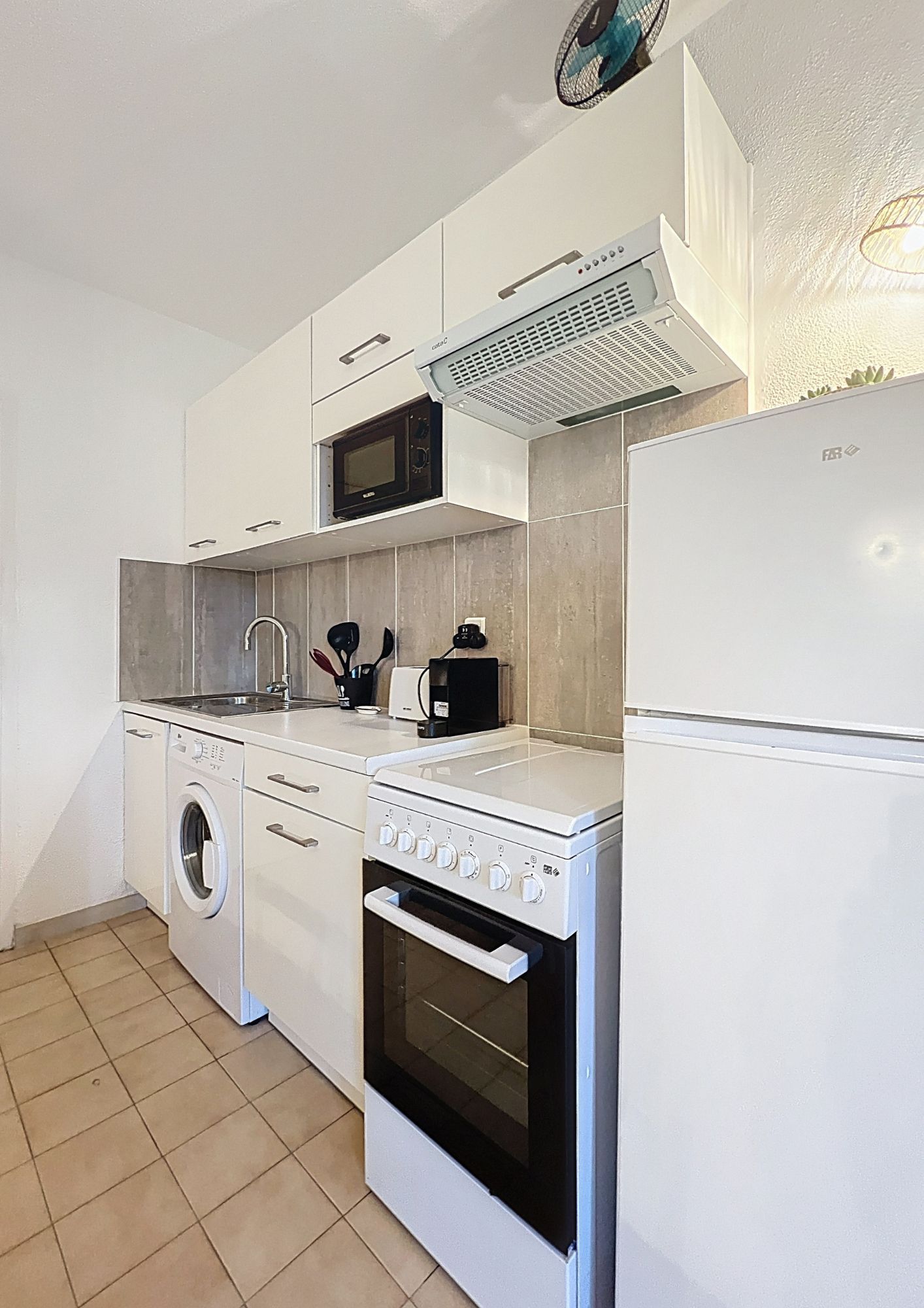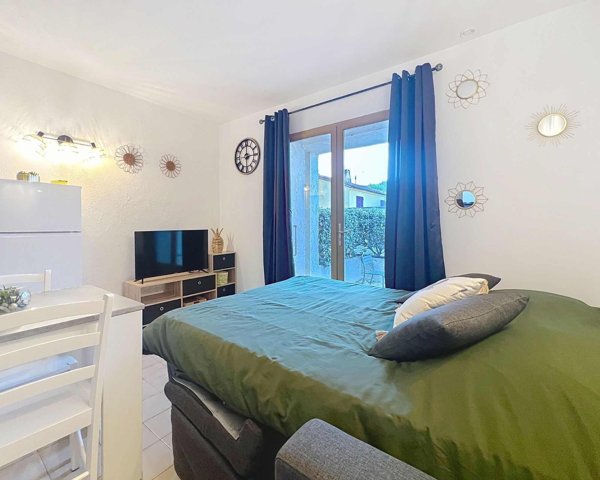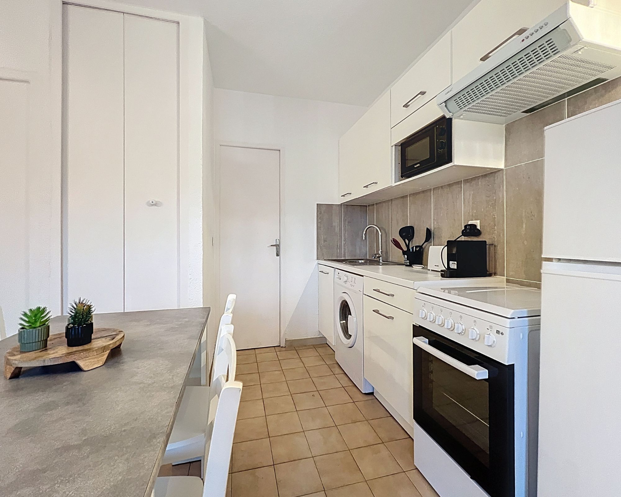 L'espace principal se compose d'un coin cuisine entièrement équipé et fonctionnel ouvert sur un Salon/séjour lumineux et accueillant aménagé avec un espace repas ainsi qu'un canapé convertible et téléviseur.