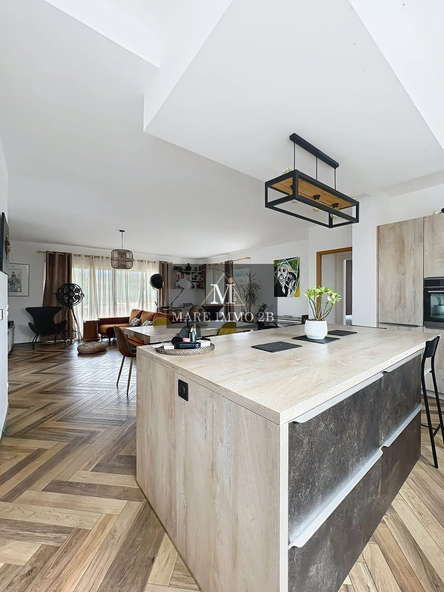 La maison principale de 155m² aux volumes harmonieux comprend en rez de chaussée : une agréable pièce de vie lumineuse avec cuisine ouverte entièrement équipée avec  ilot central.