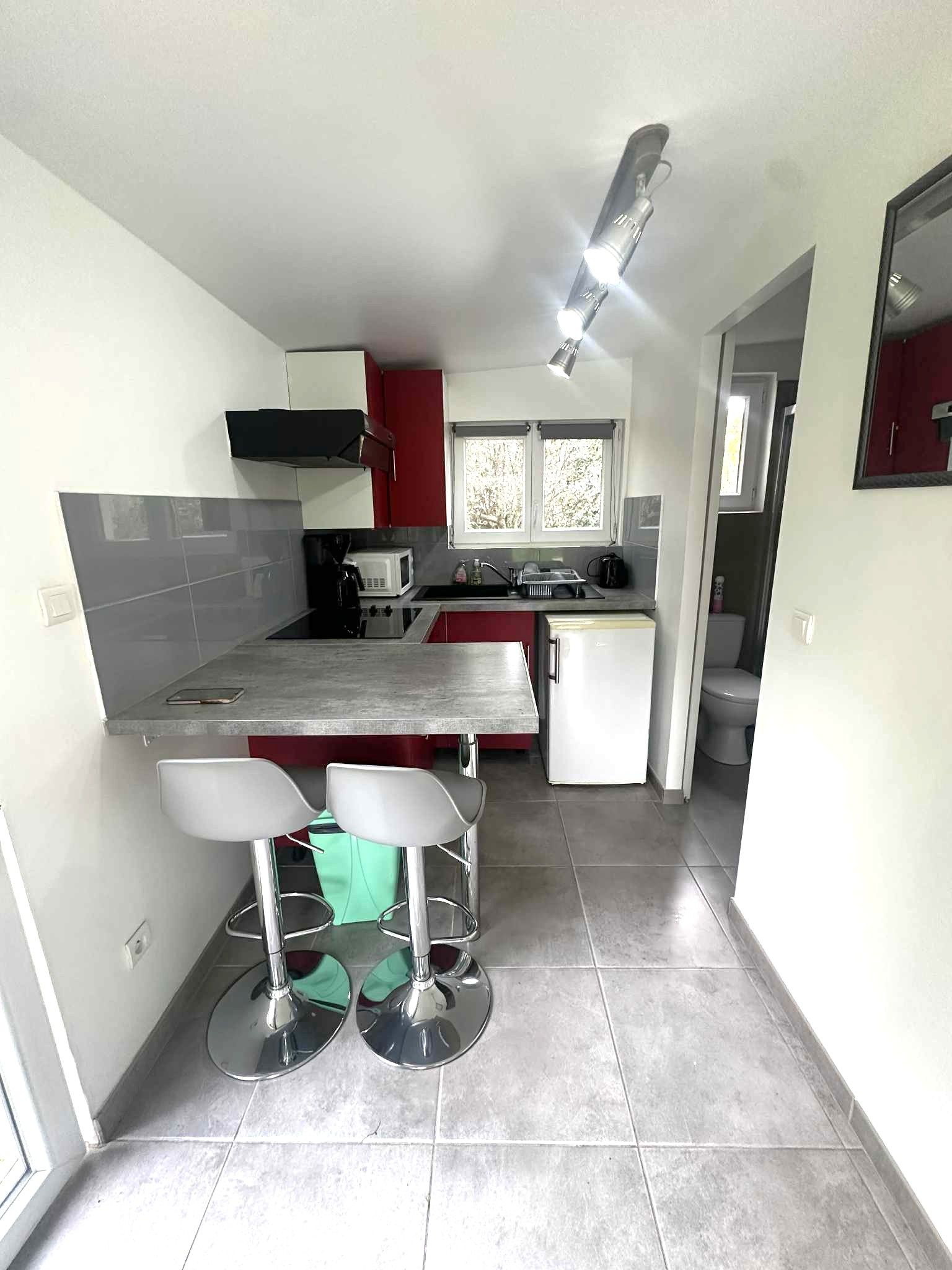Le coin cuisine équipé se distingue par ses meubles rouges modernes, apportant une touche de dynamisme et de convivialité.
