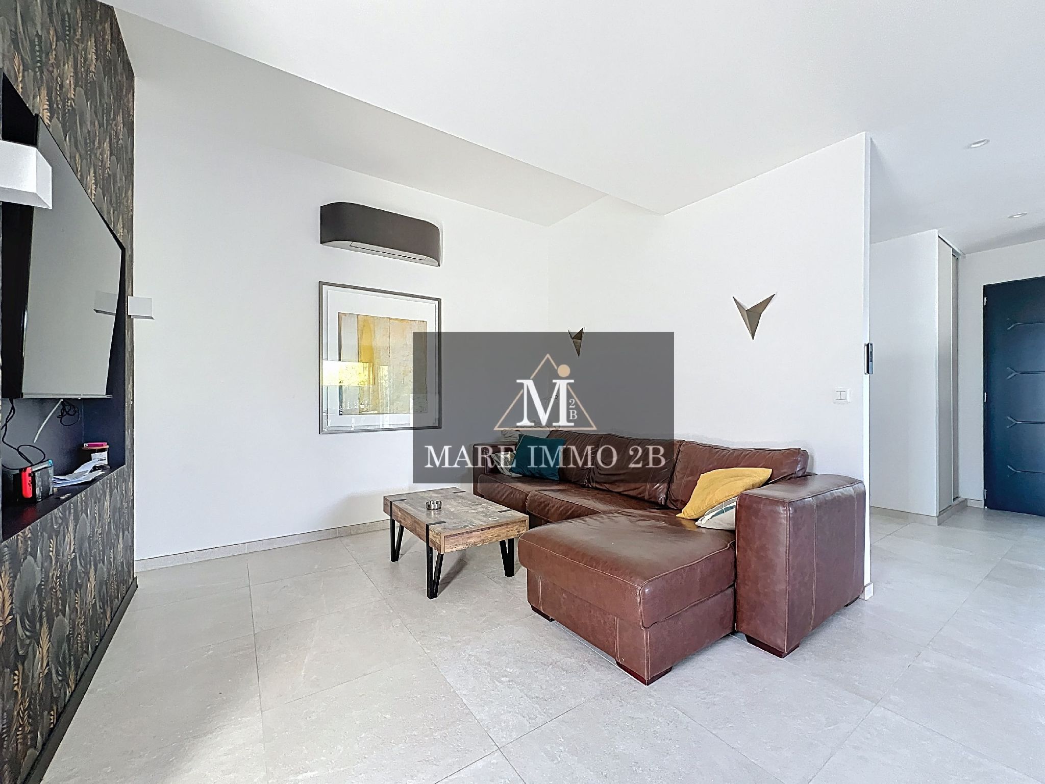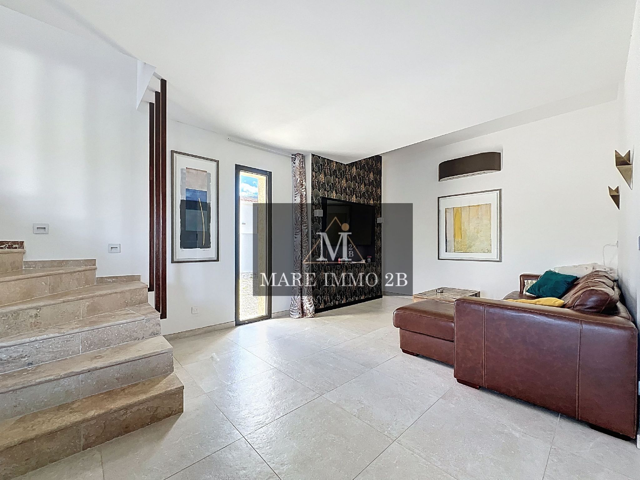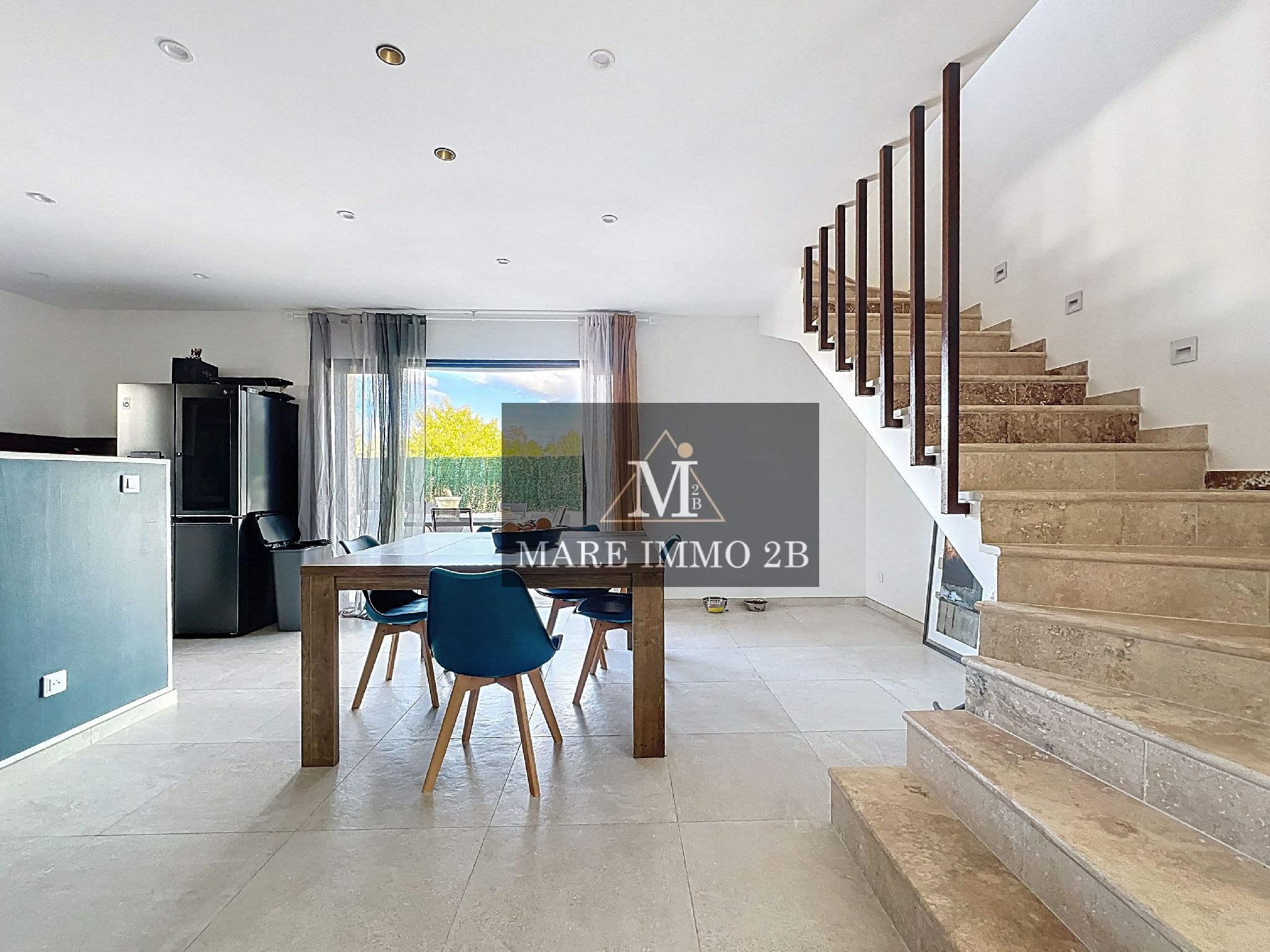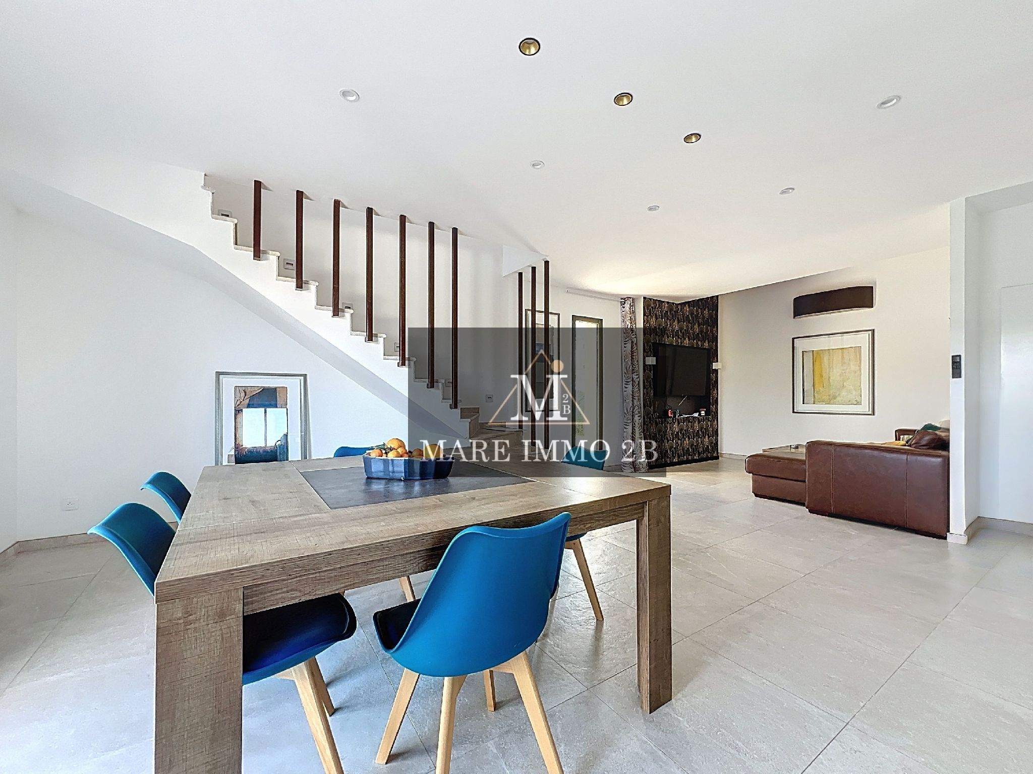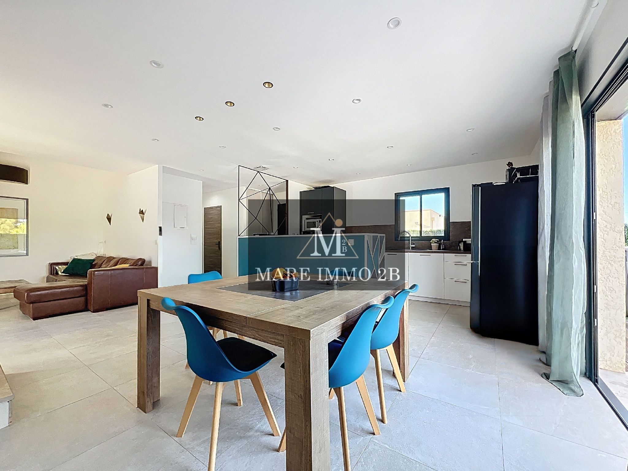 L’entrée donne sur un vaste et lumineux espace de vie. Le salon et la salle à manger bien définis. La cuisine ouverte est entièrement aménagée et semi équipée.