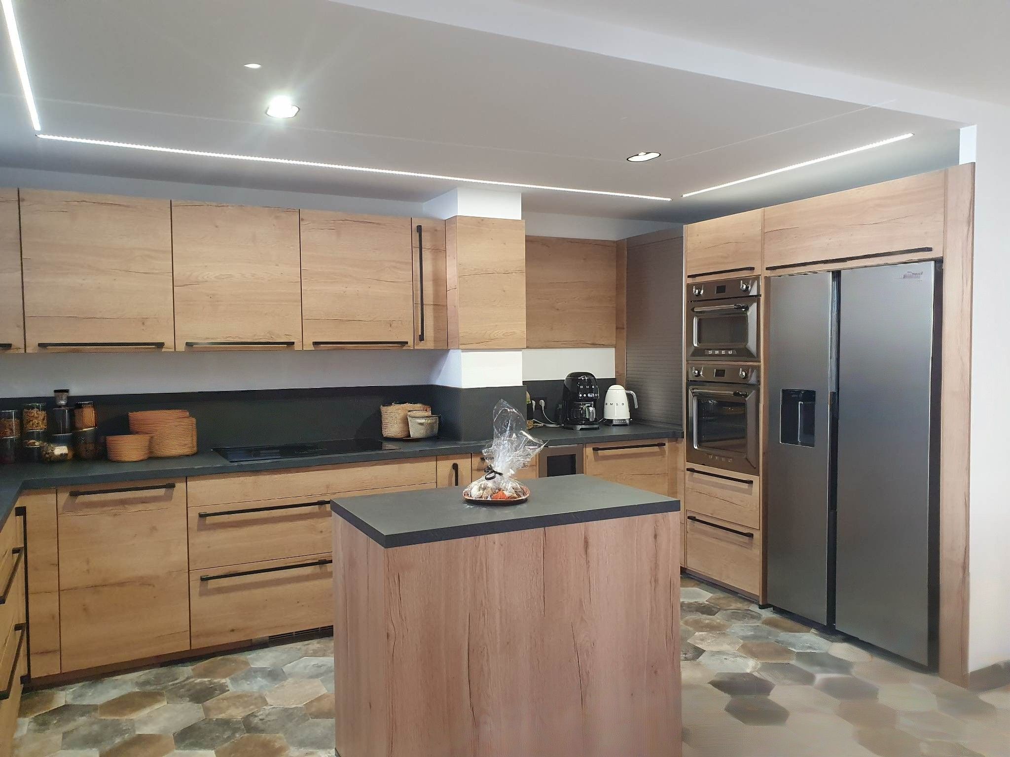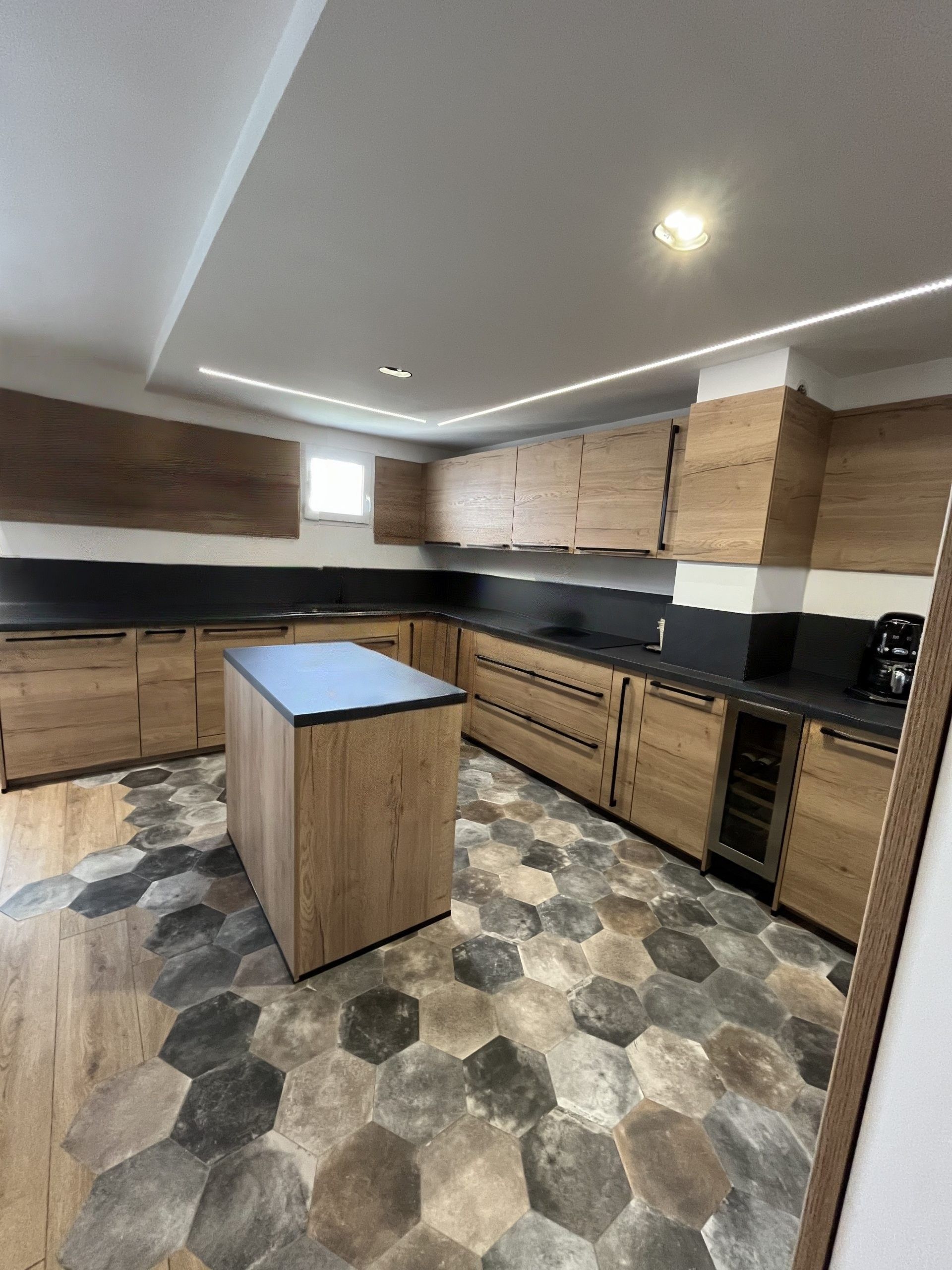 La cuisine ouverte, moderne et fonctionnelle, est dotée de nombreux rangements, d’un îlot central avec tabourets idéal pour les petits-déjeuners ou apéritifs, et de tout l’équipement nécessaire pour cuisiner comme à la maison. Le contraste entre le sol imitation parquet et les carreaux graphiques de la cuisine apporte beaucoup de caractère à l’ensemble