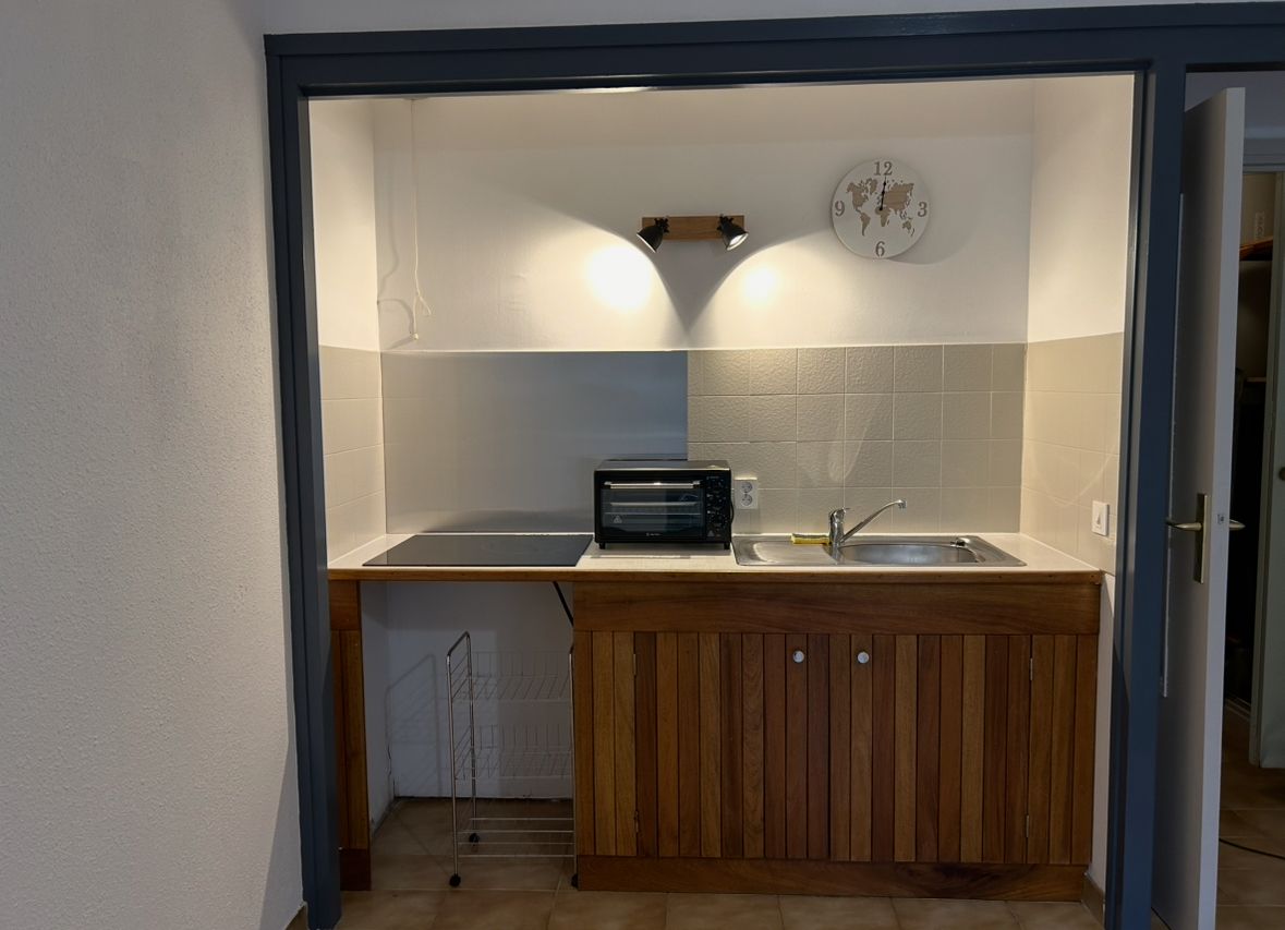 Kitchenette aménagée ouverte sur séjour , par de grandes Baies vitrées vous aurez accès à une terrasse et un jardin de 34m².